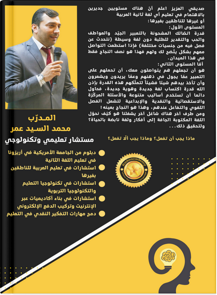 احصل على هذا العرض الكبير صديقي العزيز كتاب (PDF) بصفحات ملوّنة في فنّ تعليم اللغة الثانية بعد خبرة أكثر من عشرين عاماً في التدريب والتعليم وبعد أكثر من ثلاثة عشر عاماً في هذا التخصّص